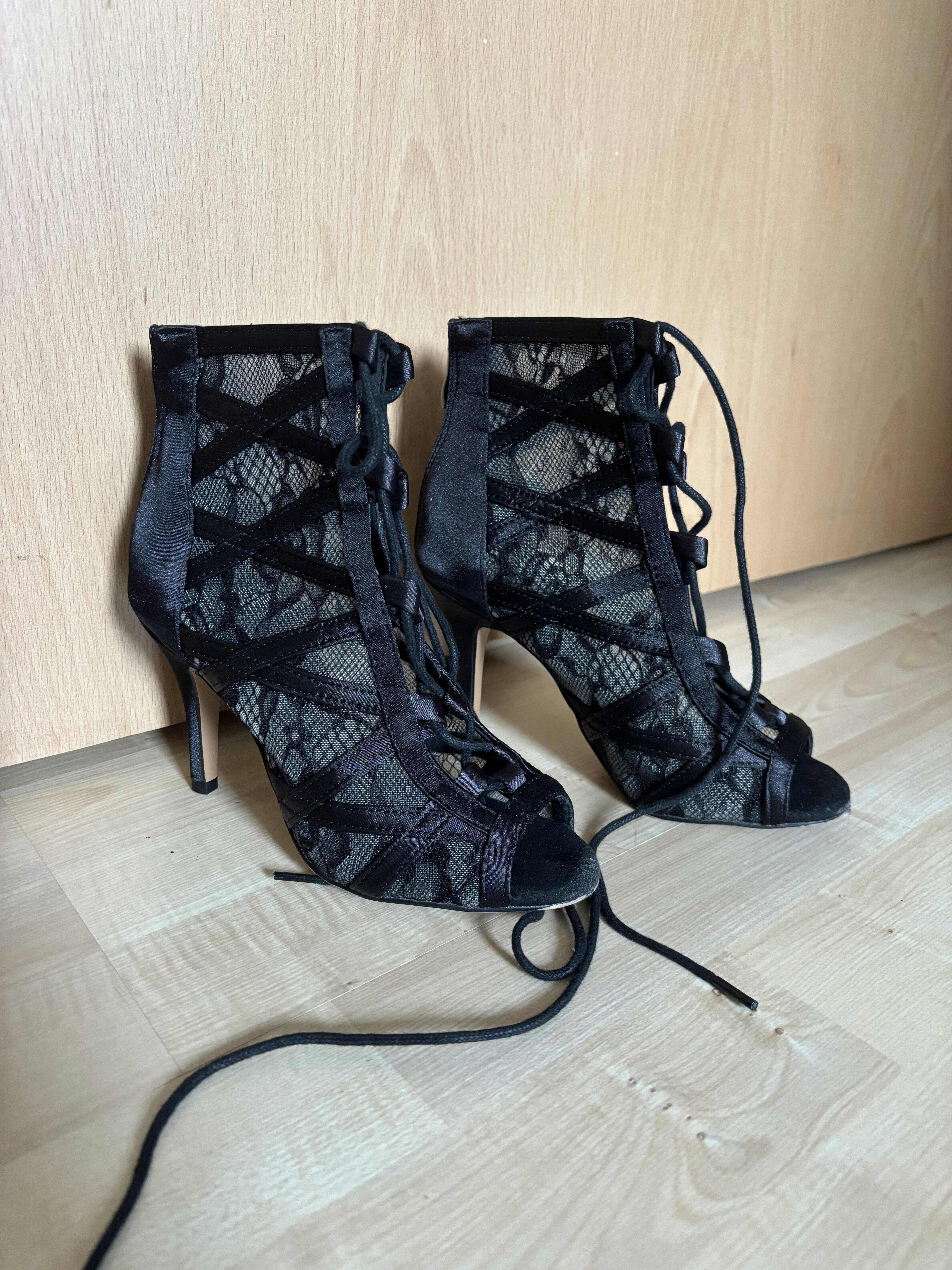 Let yourself be seduced by Bella... When the elegance of satin meets the finesse of lace, every movement becomes an invitation to sensuality. Its unique design, with criss-cross bands that extend into distinctive lacing, enhances the foot for a seductive dance. With Bella, express your femininity and dance with elegance, confidence and sensuality.