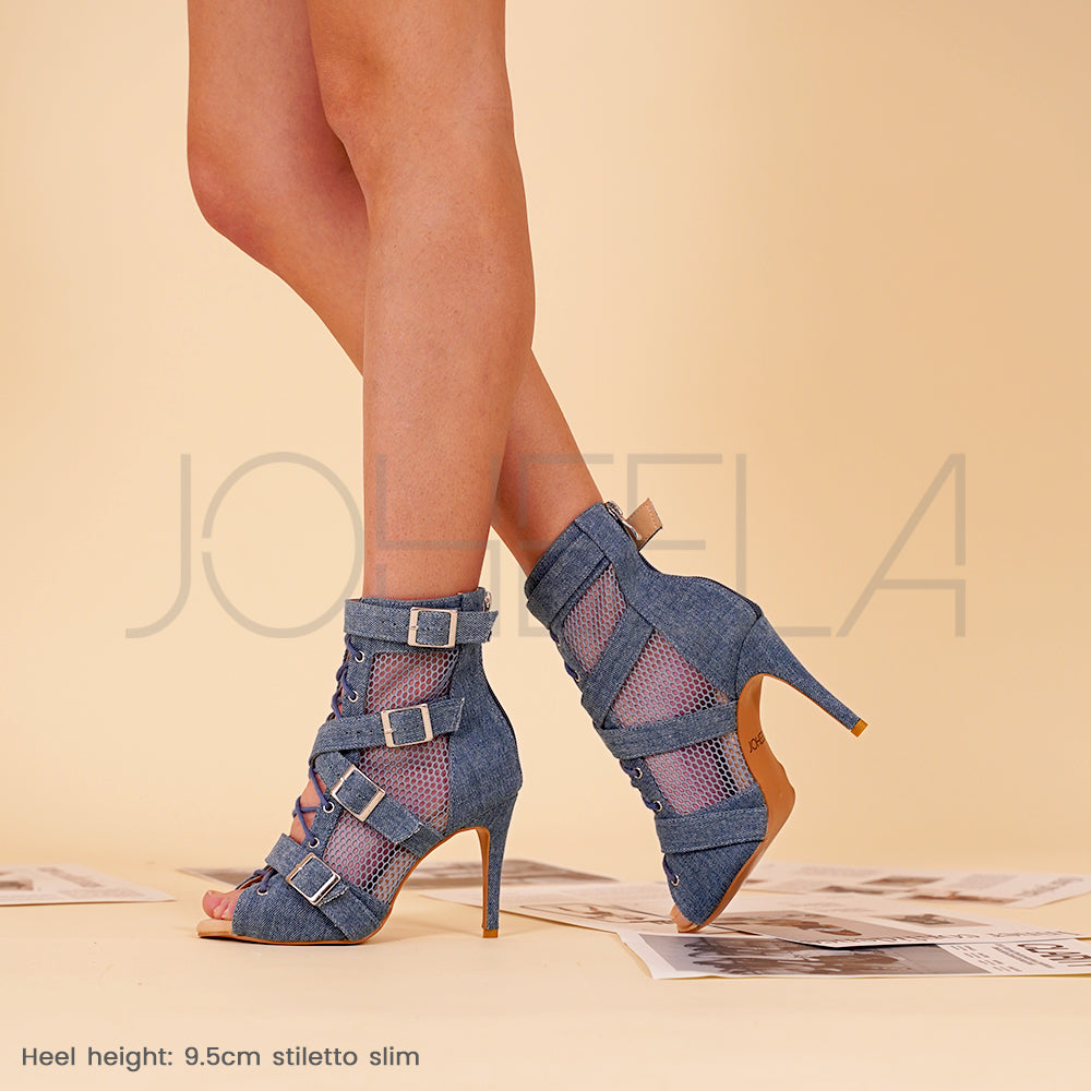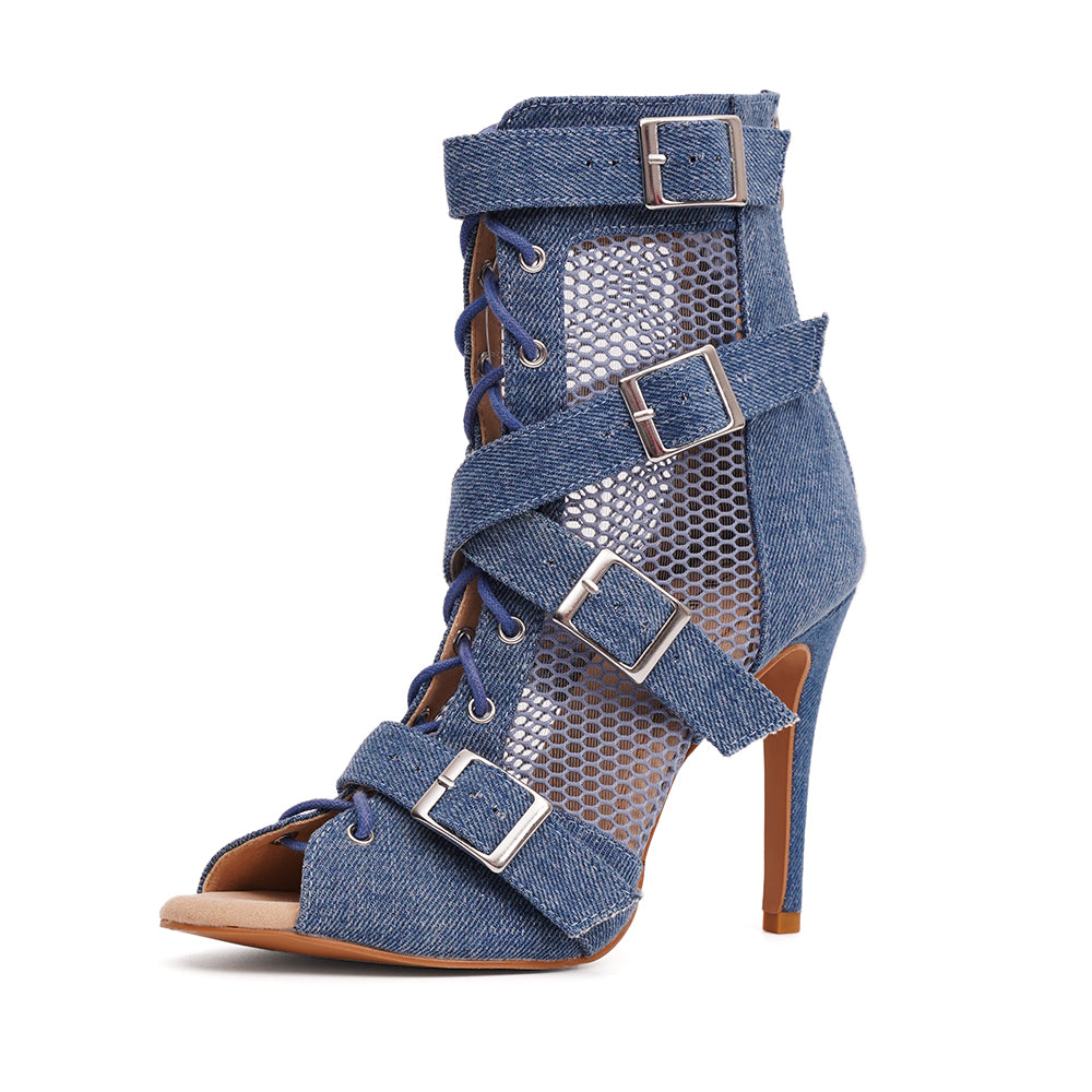 It's Britney, Bitch! Nina Denim revisits the pop aesthetic of the 2000s by combining denim, fishnet, and metal buckle straps. A true Y2K icon, her blue denim pairs easily with any outfit, while her crisscross straps provide support and style, bringing a fresh, sexy, and urban energy to your every moves. A pair designed for dancing with flow and attitude, allowing you to embody the pop icons that marked an entire generation.