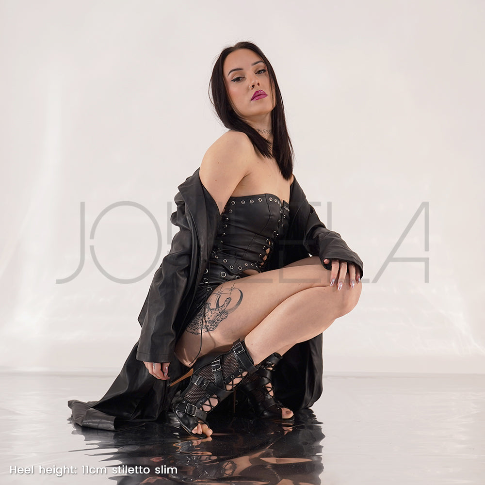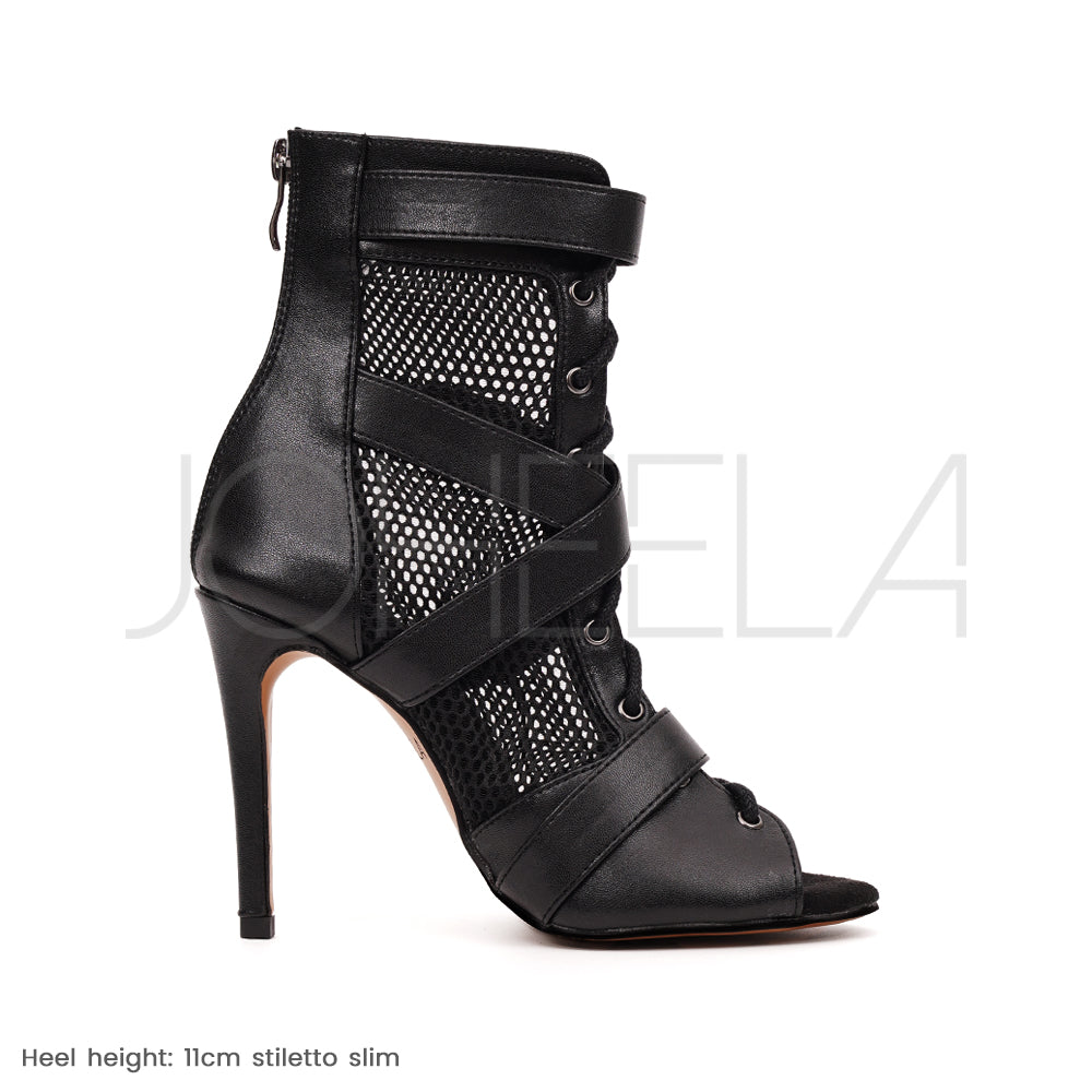¡Expresa tu energía femenina magnética con Nina Negro! Sus correas cruzadas con hebillas metálicas dibujan una silueta gráfica y potente, a la vez que proporcionan una sujeción infalible. Entre el cuero vegano mate y la malla de rejilla, su diseño estructurado juega con la transparencia para mostrar un aspecto oscuro y magnético. Su aspecto ultramoderno aporta carácter e intensidad a cada movimiento para bailar con confianza y una presencia cautivadora.